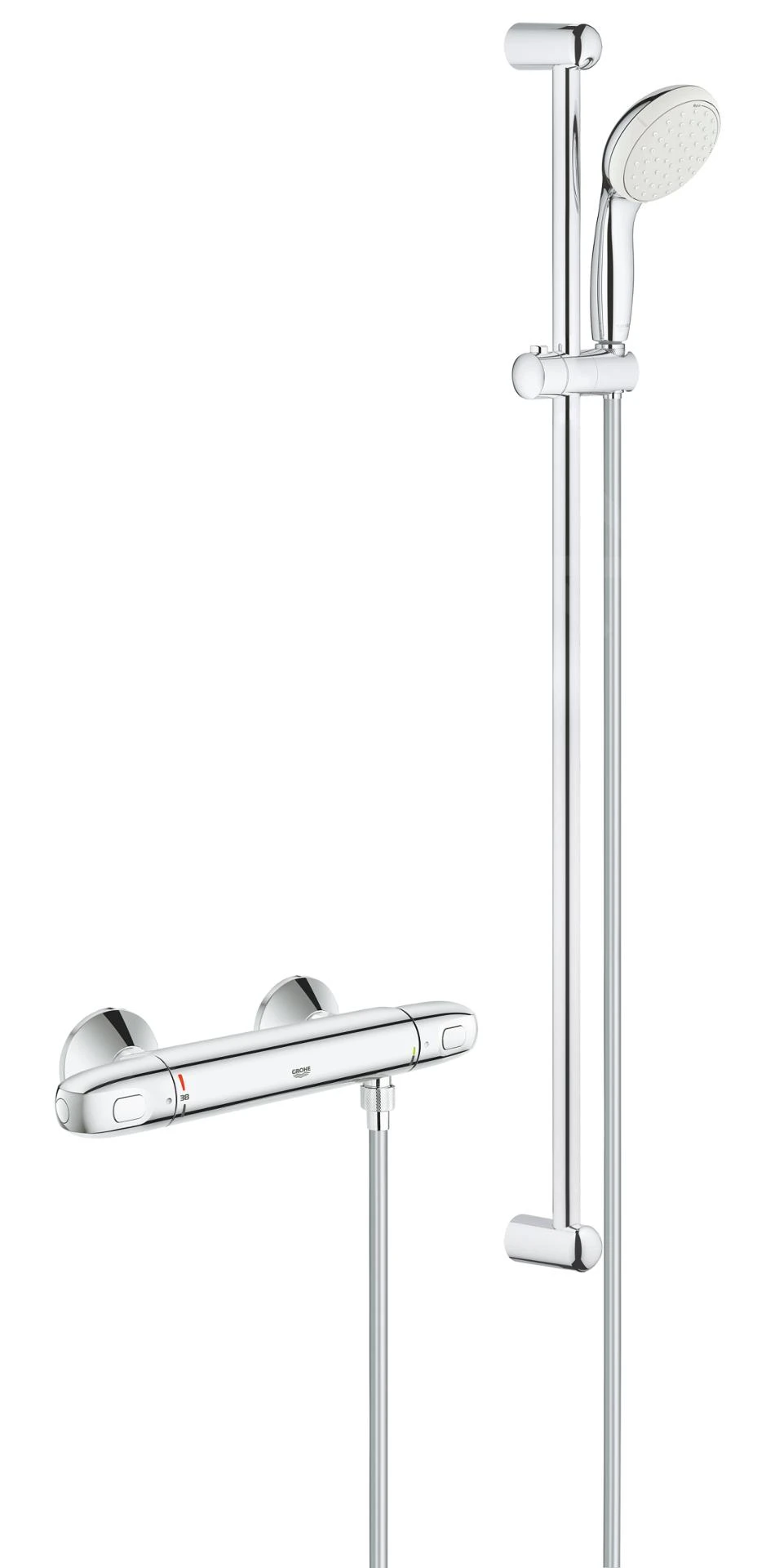Deze complete set bevat een thermostatische douchekraan, een handdouche en een douchestang. De handdouche verwent uw huid met twee verschillende straalstromen – Rain en Jet – en is dankzij het SpeedClean systeem tegen kalkaanslag buitengewoon eenvoudig schoon te maken. Temperatuurschommelingen in de douche behoren tot het verleden, omdat deze nieuwe thermostatische kraan de betrouwbare GROHE TurboStat® technologie bevat. Het SafeStop beveiligingssysteem met een temperatuurlimiet van 38 °C beschermt de gebruiker tegen een ongewenste temperatuurverhoging. Indien nodig kan echter een hogere temperatuur worden ingesteld. Dankzij de GROHE CoolTouch® technologie zal de buitenkant van de kraan nooit te heet zijn om aan te raken. Deze set is vervaardigd met de verchroomde GROHE StarLight® afwerking met ergonomische metalen handgrepen en een douchestang van 900 mm, waarmee de set een perfect accessoire voor uw badkamer vormt, die bovendien bijdraagt aan waterbesparing – dankzij de GROHE EcoJoy® technologie.
