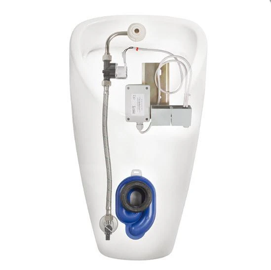 keramisch urinoir, rail met radarspoeler en geïntegreerde transformator, elektromagnetische klep, kogelkraan, speciale watertoevoerarmatuur met afdichting, sifon, bevestigingsset, montagesjabloon